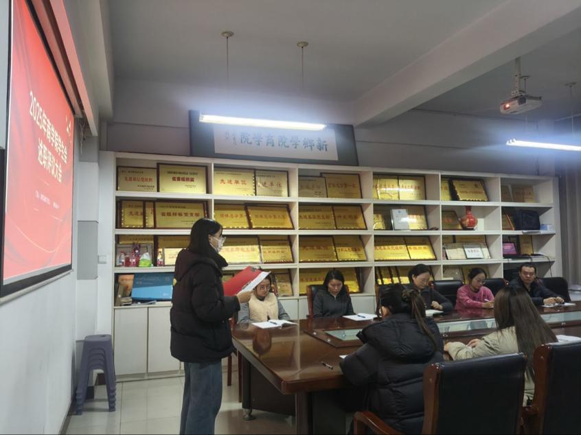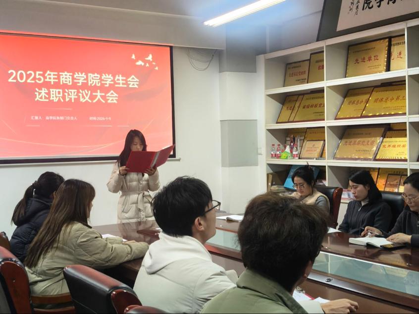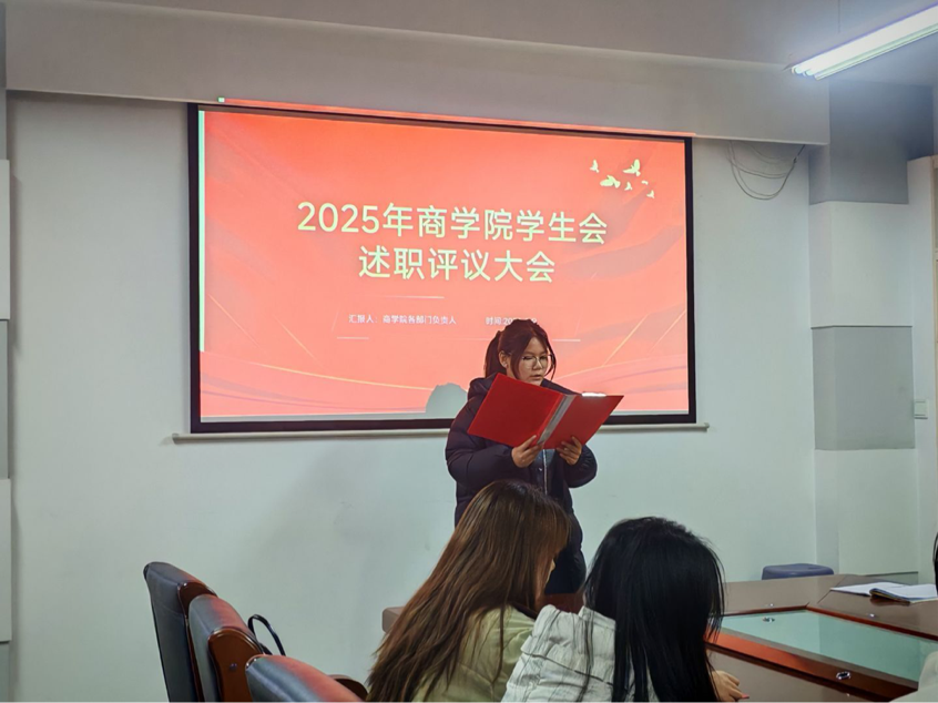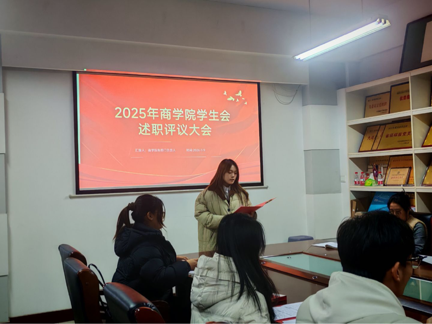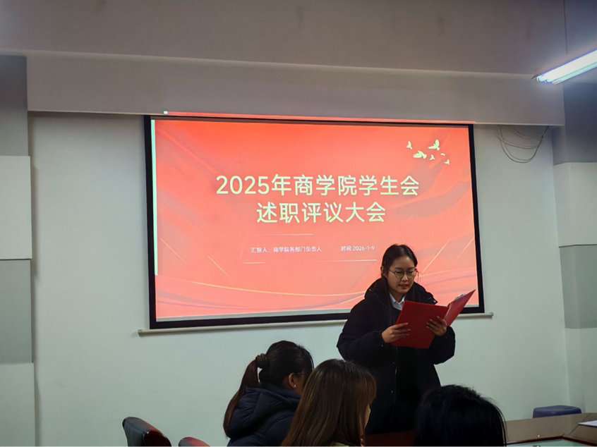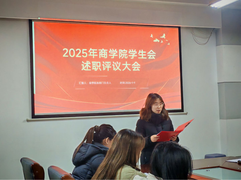为全面总结 2025 年度学生会工作成效,明确后续发展方向,1 月 9 日,商学院在 A03 会议室召开 2025 年度学生会述职评议会。学院党委副书记李雅林、团委书记李然、相关辅导员与学生代表一同参加了会议。