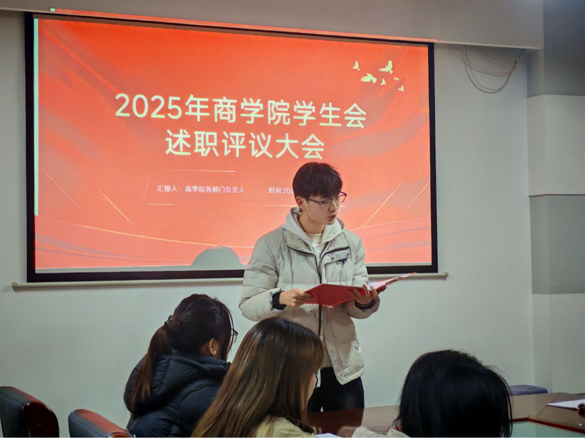 述职评议会上,学生会主席团成员吴新宇从整体工作视角出发,系统复盘了 2025 年度学生会的工作脉络,全面梳理了各项重点任务的推进情况,分享了工作中的宝贵经验与深度思考。督学部、涉外部、团办部等八个部门负责人依次上台,围绕部门核心职责、年度工作成果、存在的问题与不足及未来工作计划等方面展开详细汇报,各展所长、各述其职,充分展现了商学院学生会求真务实、积极进取的良好风貌。