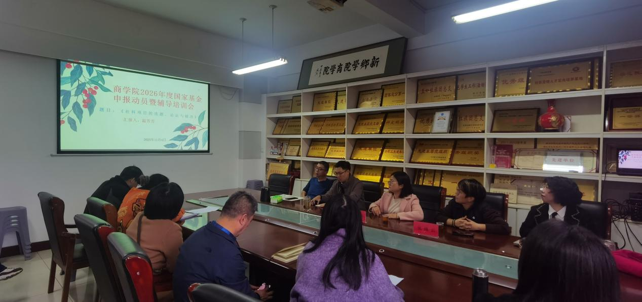 为系统谋划、精准部署2026年度国家基金项目申报工作,切实提升项目申报质量,11月4日下午,商学院在会议室召开国家基金项目申报动员暨辅导培训会。院长周斌、副院长李晓红和李蛟、科研处社会科学管理科科长张绪云以及全体教师参加会议,周斌主持此次会议。