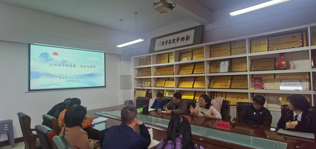 联合科研处特邀河南科技大学河南科技大学图书馆馆长、档案馆馆长、博士生导师温芳芳教授来院,作题为《社科项目的选题、论证与修改》的专题动员暨辅导培训会,吸引了众多拟申报项目的科研骨干与青年教师积极参与。会议在我院会议室举行,温芳芳教授结合自身丰富的科研经历和多次成功申报国家基金项目的实战经验,从国家基金的评审流程、政策导向、项目选题、申请书撰写要点及常见问题剖析等多个维度,进行了全面系统、深入浅出的讲解。她特别强调,精准把握学科前沿、凝练特色创新点是申报成功的核心,而严谨规范的文本表述与清晰可行的研究方案则是打动评审专家的关键。温教授的辅导内容翔实,案例生动,既有宏观层面的战略分析,也有微观层面的技巧点拨,为与会教师提供了极具价值的指导。