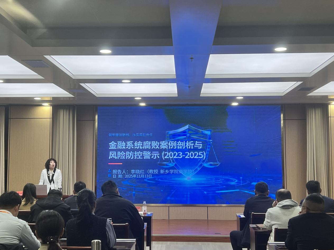 11 月 13 日下午,新乡学院商学院教授李晓红以 “筑牢廉洁防线,压实高管责任” 为主题,到新乡市委党校为新乡市金融机构高管人员进行《金融系统腐败案例剖析与风险防控警示》专题报告。