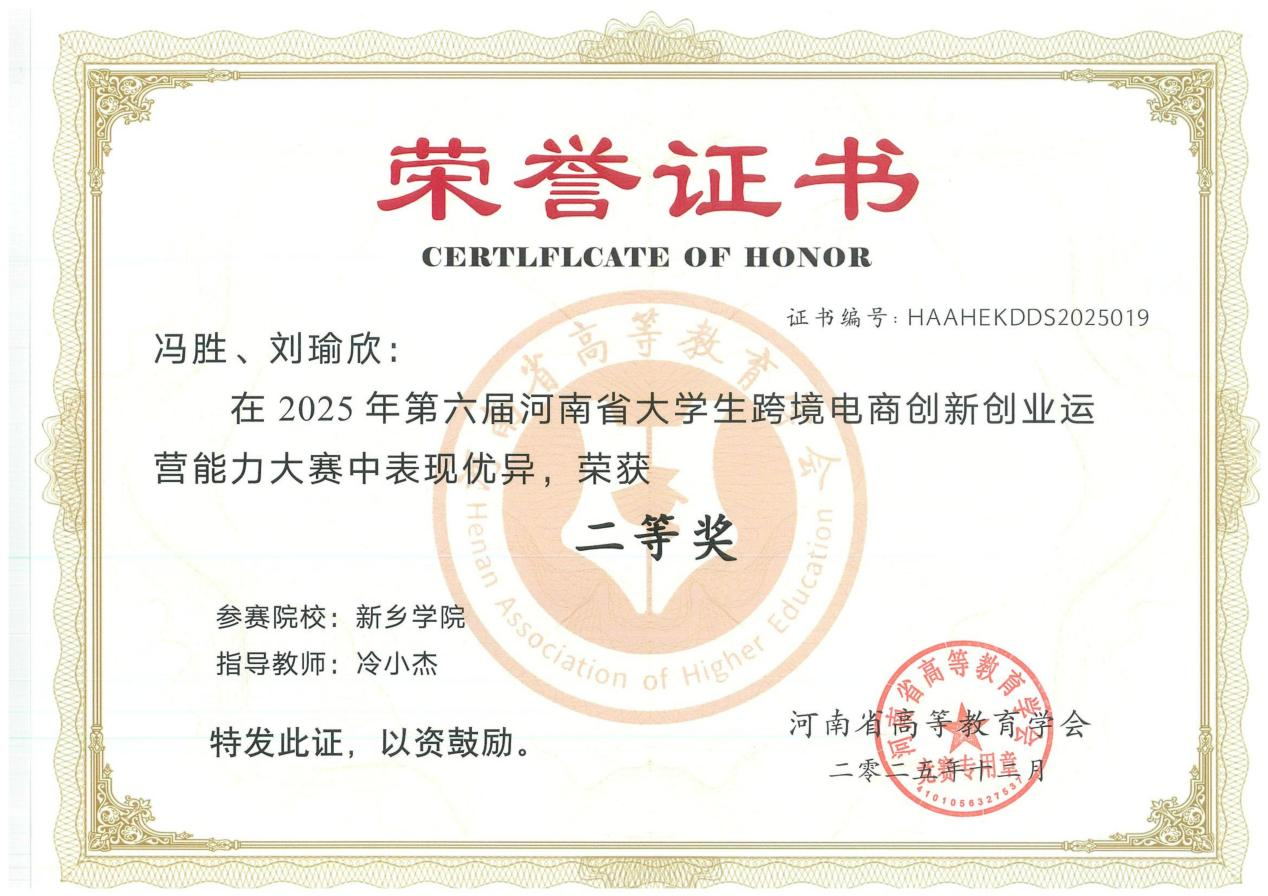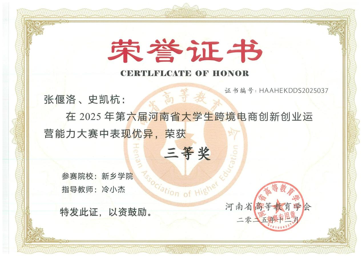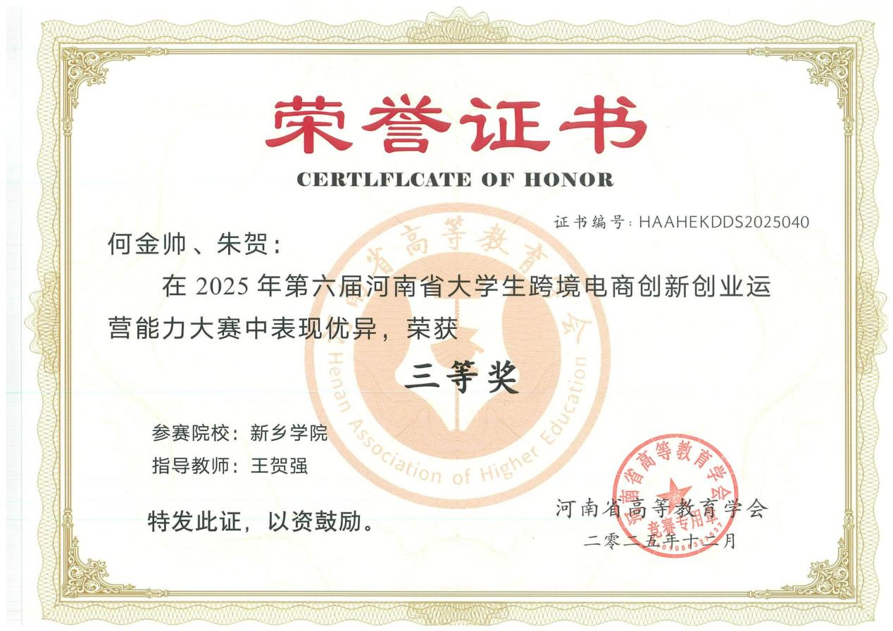 2025年12月7日,由河南省高等教育学会主办的第六届河南省大学生跨境电商创新创业运营能力大赛在郑州商学院圆满落幕。跨境电商创新创业运营能力大赛是省内影响力广泛的跨境电商类学科竞赛,吸引了全省包括郑州大学、河南大学在内的68所高校的193支团队同场竞技。面对激烈的竞争,由商学院骨干教师王贺强、冷小杰老师共同指导三个学生团队:“加薪有米队(冯胜、刘瑜欣)”、“亿想不到队(张偃洛、史凯杭)”、“蛋仔派队(何金帅、朱贺)”凭借扎实的专业功底、创新的运营策略与高效的团队协作脱颖而出,分获二等奖1项,三等奖2项。